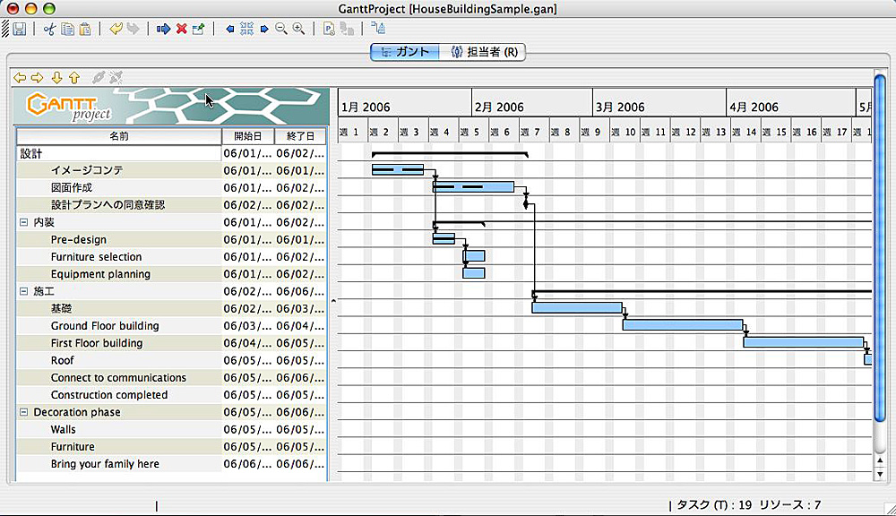 Mac版にはついていなかったが、Win版にはHouseBuildingSampleという家を建てるときの工程図の見本がついていた。日本語も使えるので、一部sampleを日本語にしてみた。webで探せば使い方を書いたページもいくつか出てくる。この程度のチャートを書くだけならexcelでもいいようだが、工事に遅れや変更はつきものだ。そんな時は、やはりこのような専門のソフトのほうが便利だ。 また、htmlで保存することもできるので、web上で情報を共有することも可能だ。